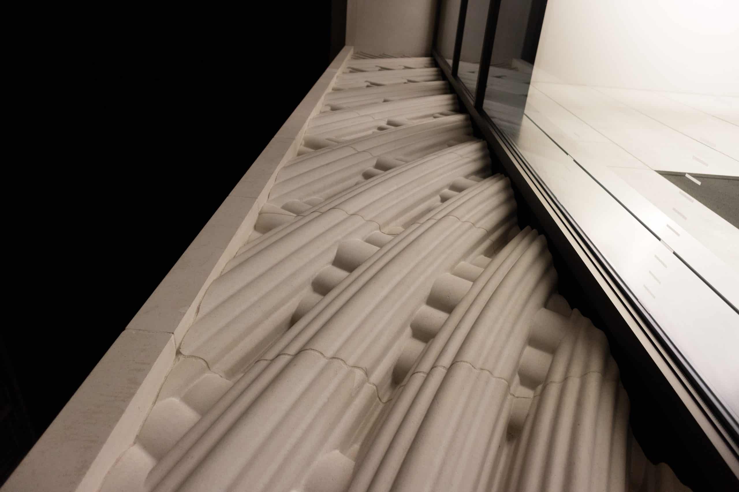 Through development, the sculpture has become a three-dimensional abstract collage of extracts from certain structures and forms in relief, that one might associate with the notion of polychrome or architectural elements of this era. Portland stone gives the piece it’s subtle, understated, monochrome aesthetic that only reveals its true qualities upon closer inspection.