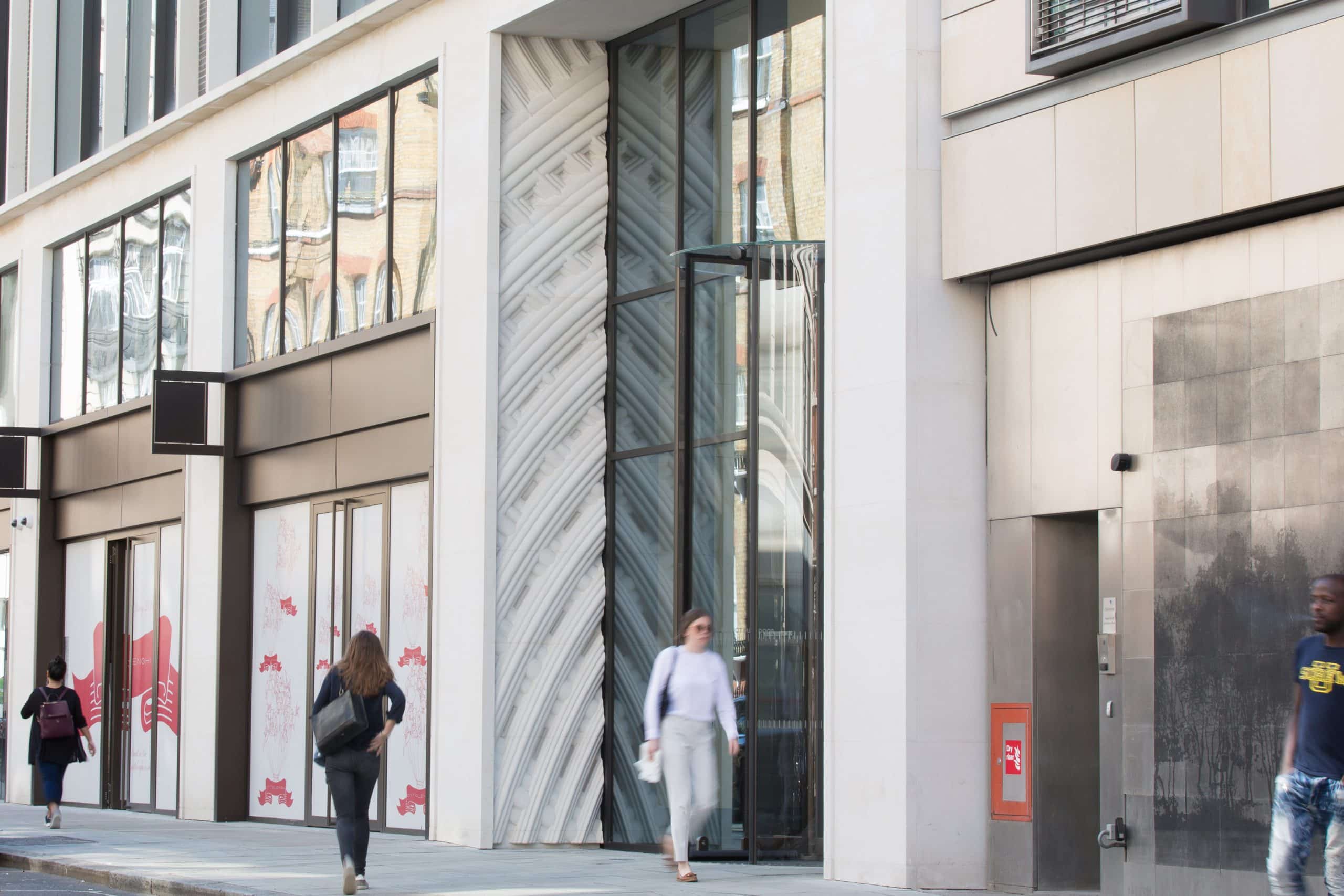 The sculpture is situated on the left-hand side of the entrance to 55 Wells Street, adding a sense of identity and arrival to this newly commissioned building. The sculpture runs the full height of the lower ground floor entrance at six meters in height.