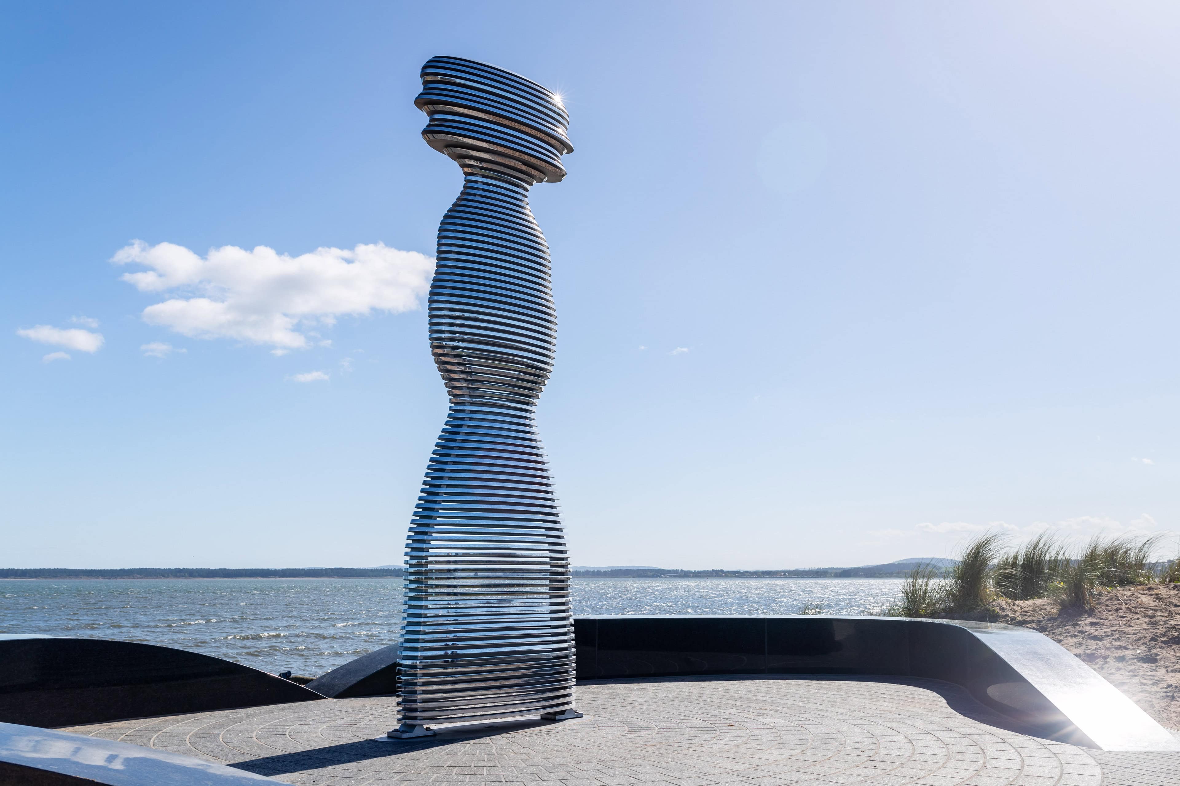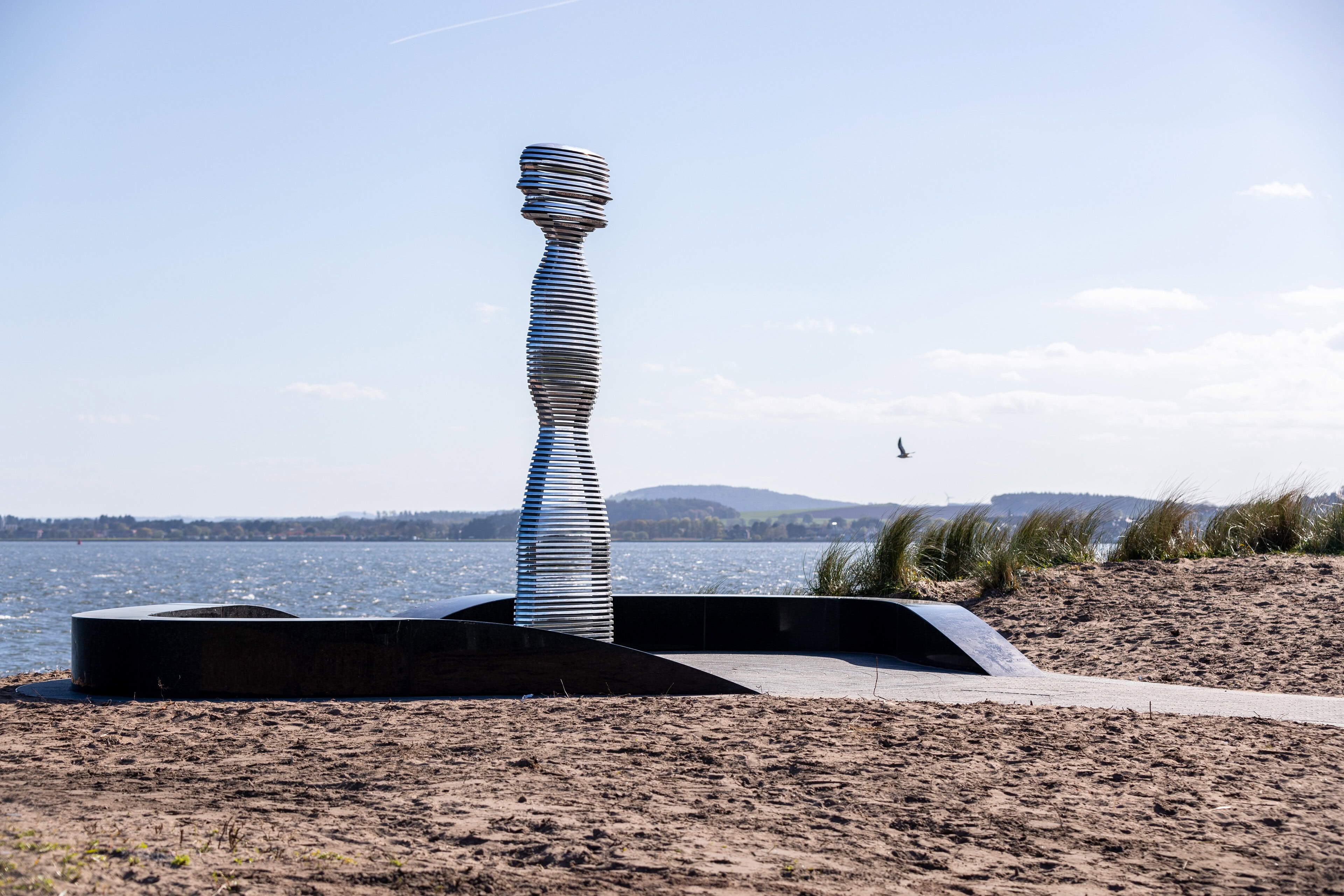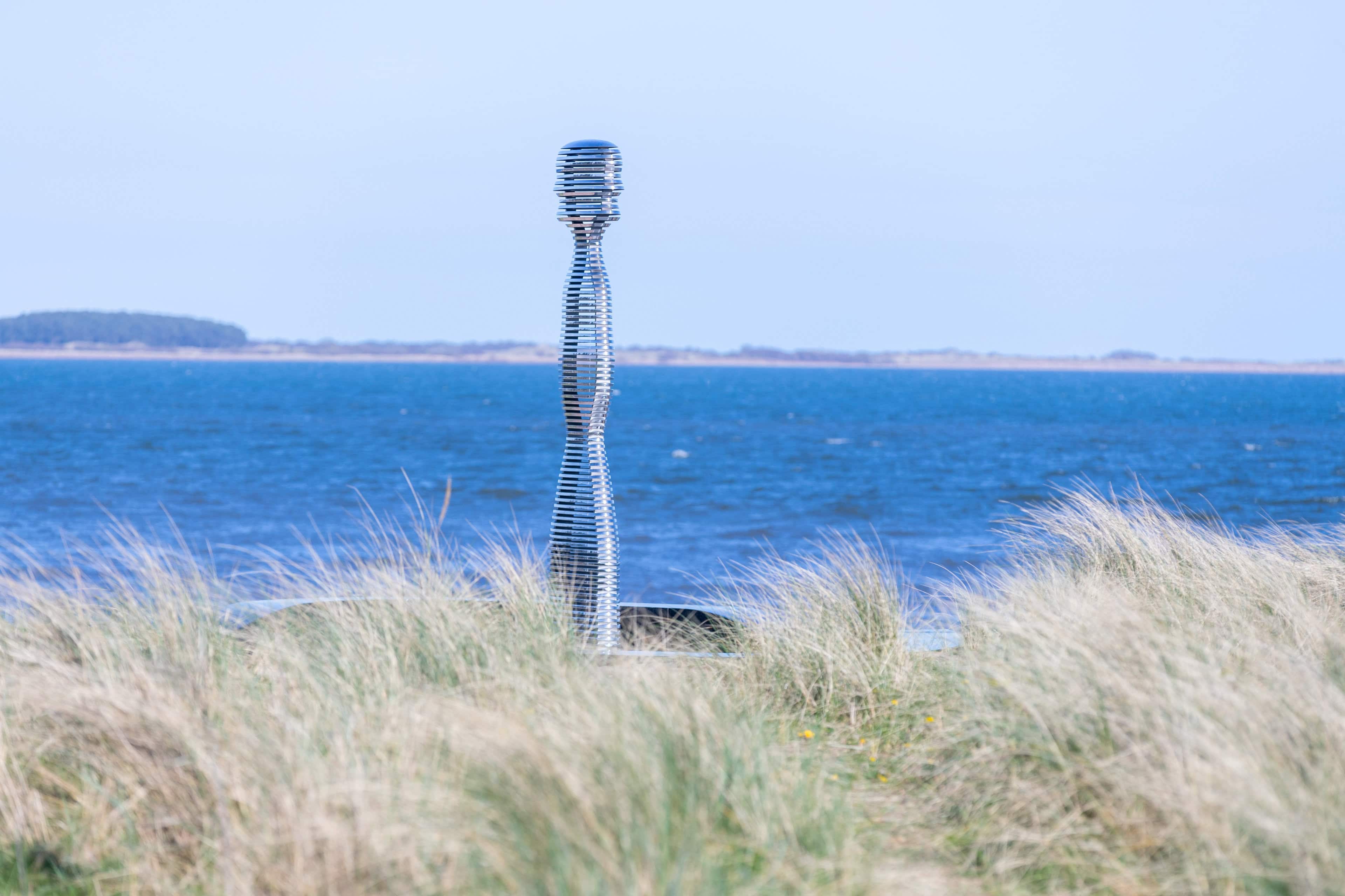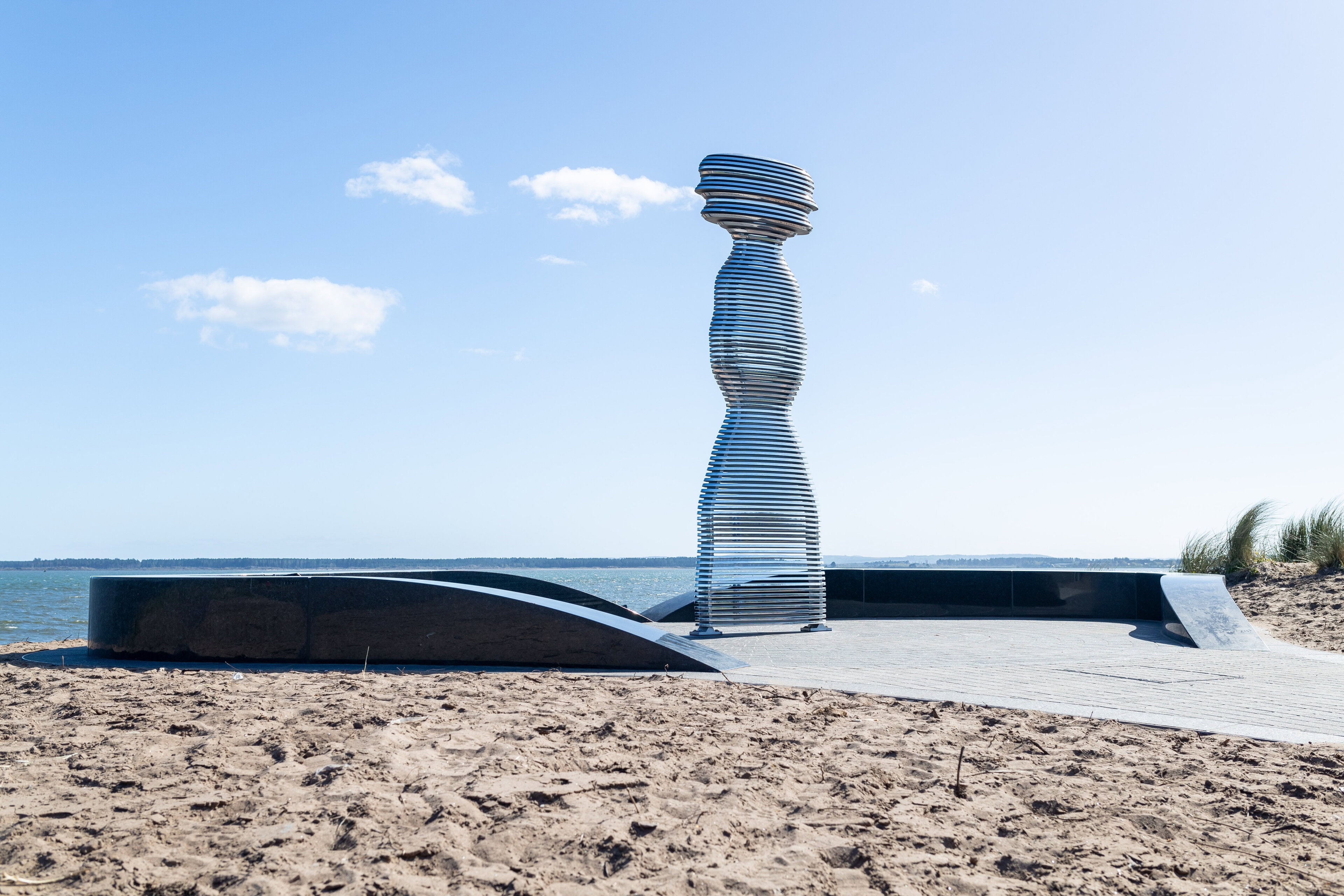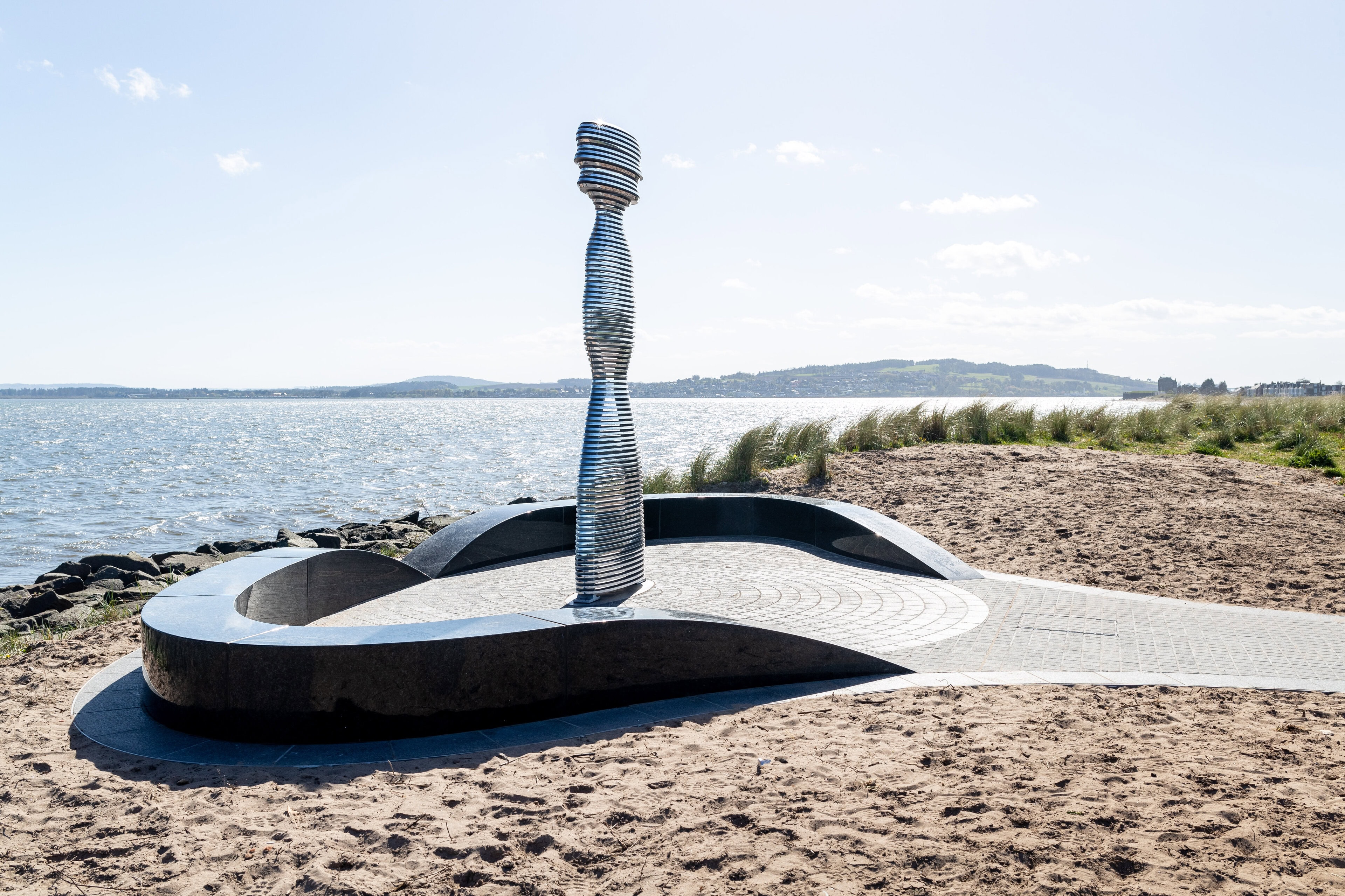 Situated on the banks of the River Tay—Scotland’s longest river—Tay Haze stands just under four meters tall and is accessible via a newly developed active travel route stretching from Broughty Ferry to Monifieth. Set against the vast expanse of the River Tay, the sculpture’s specially chosen location sits at a natural outcrop that extends into the river, creating a beacon-like presence reminiscent of the lighthouses visible in the distance.