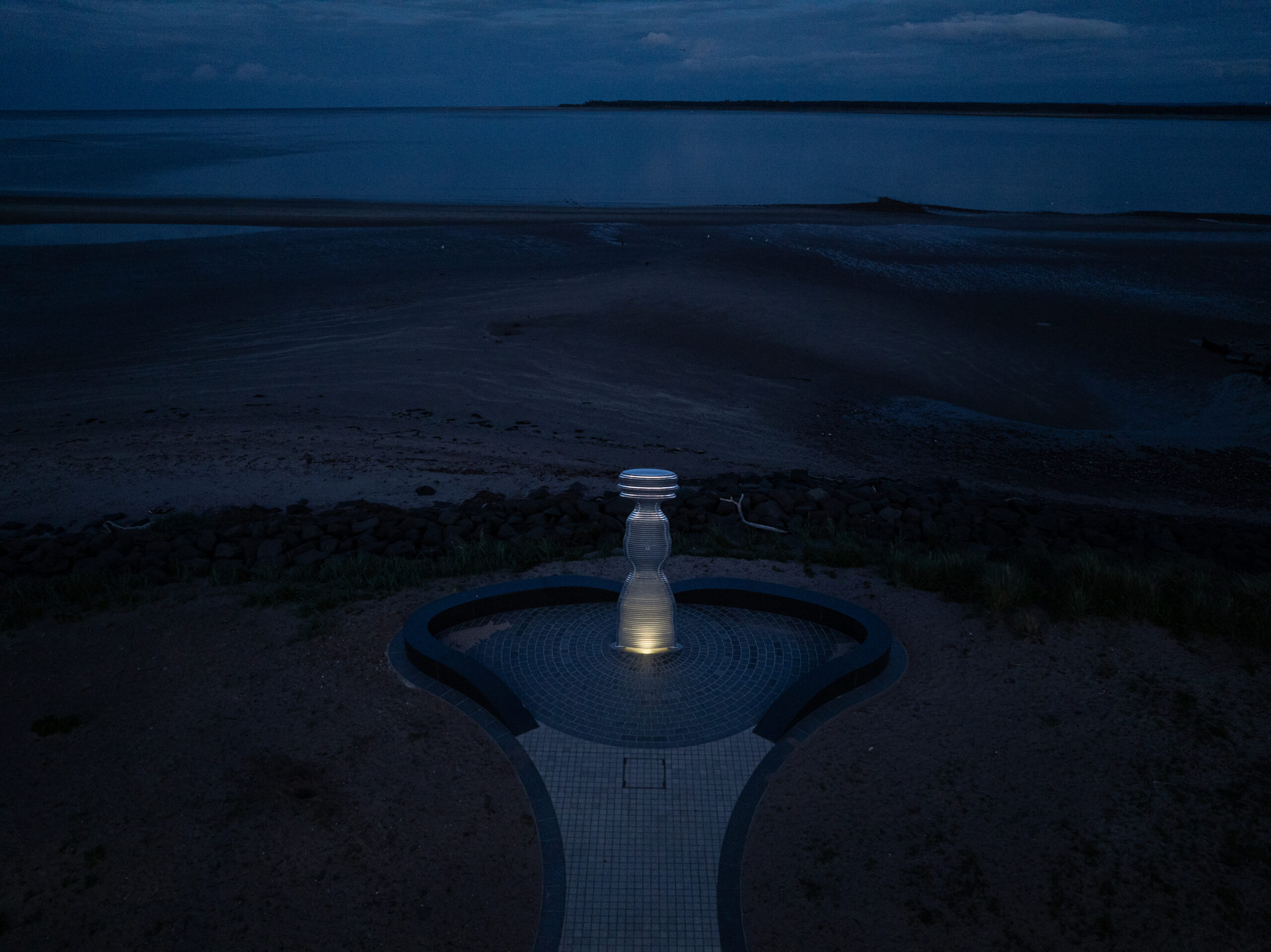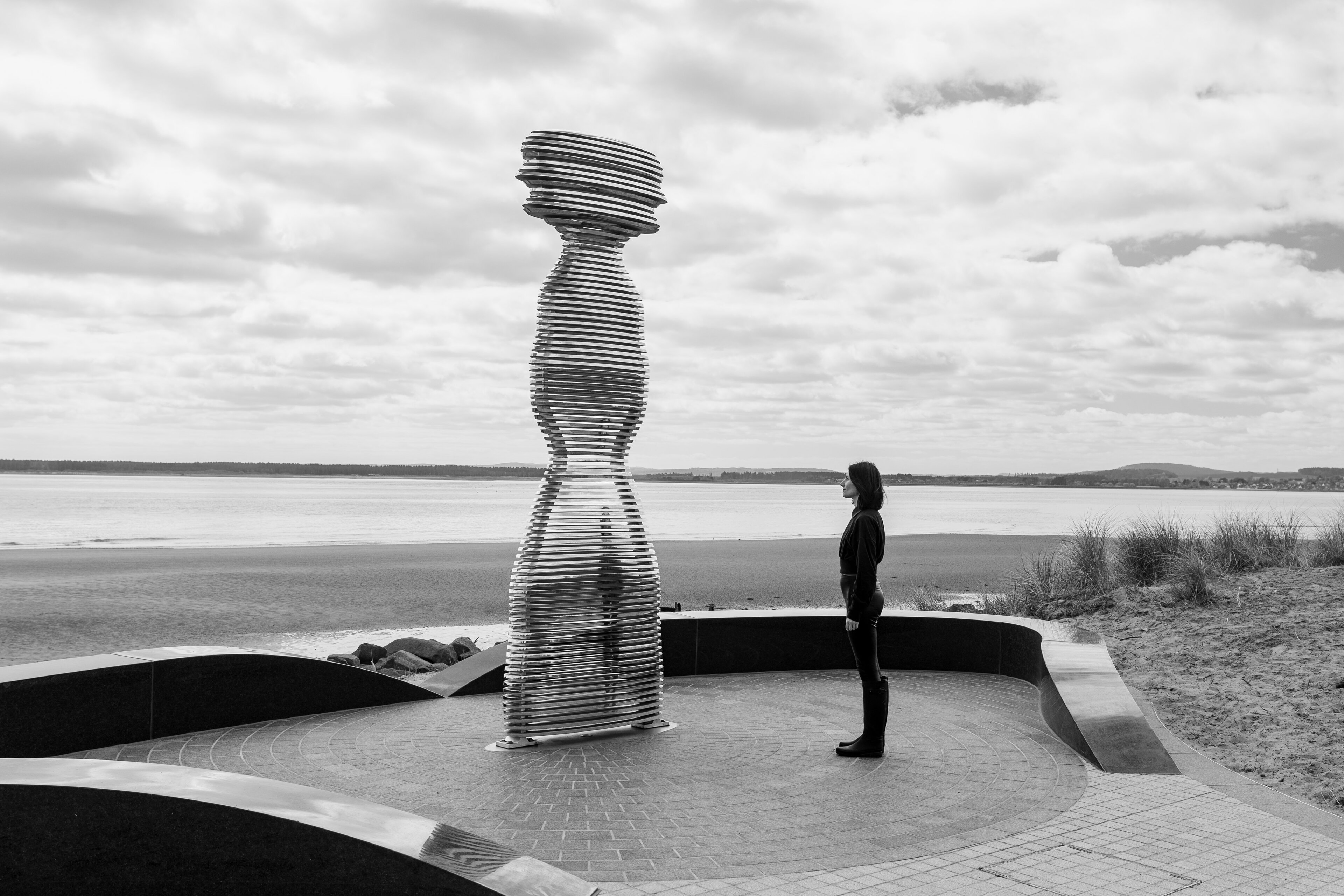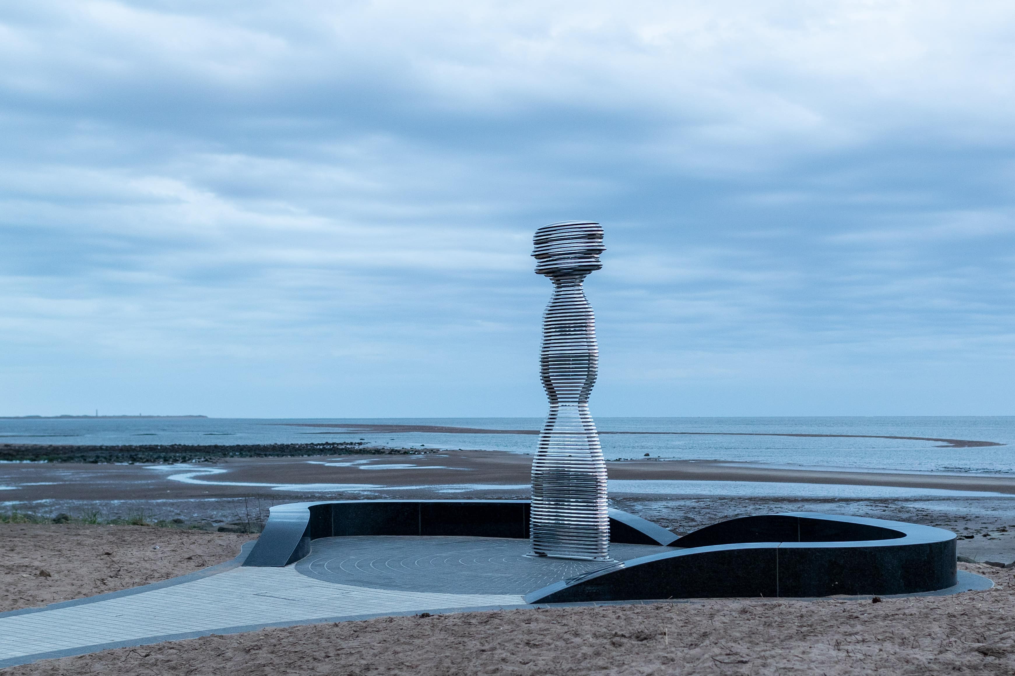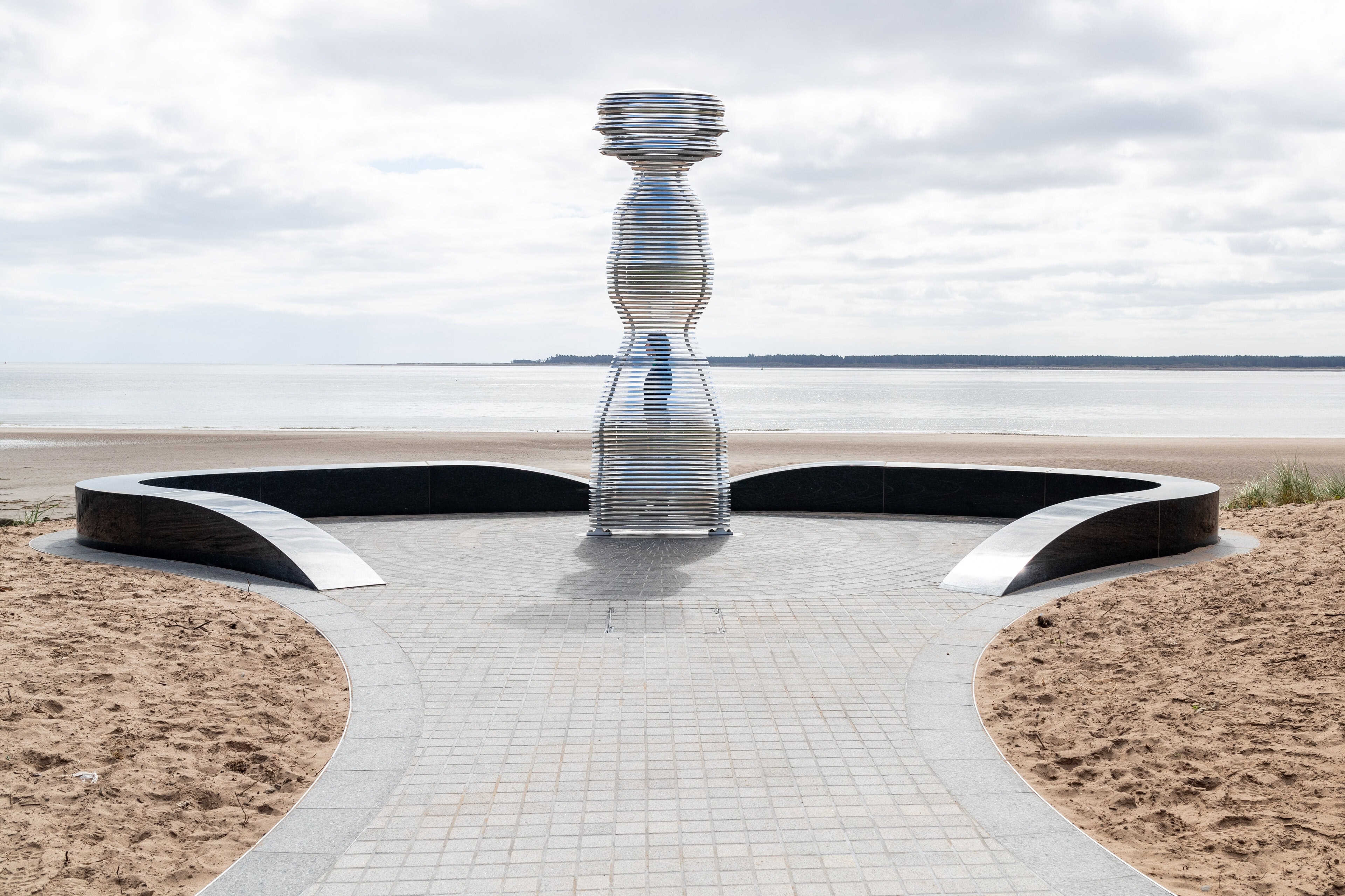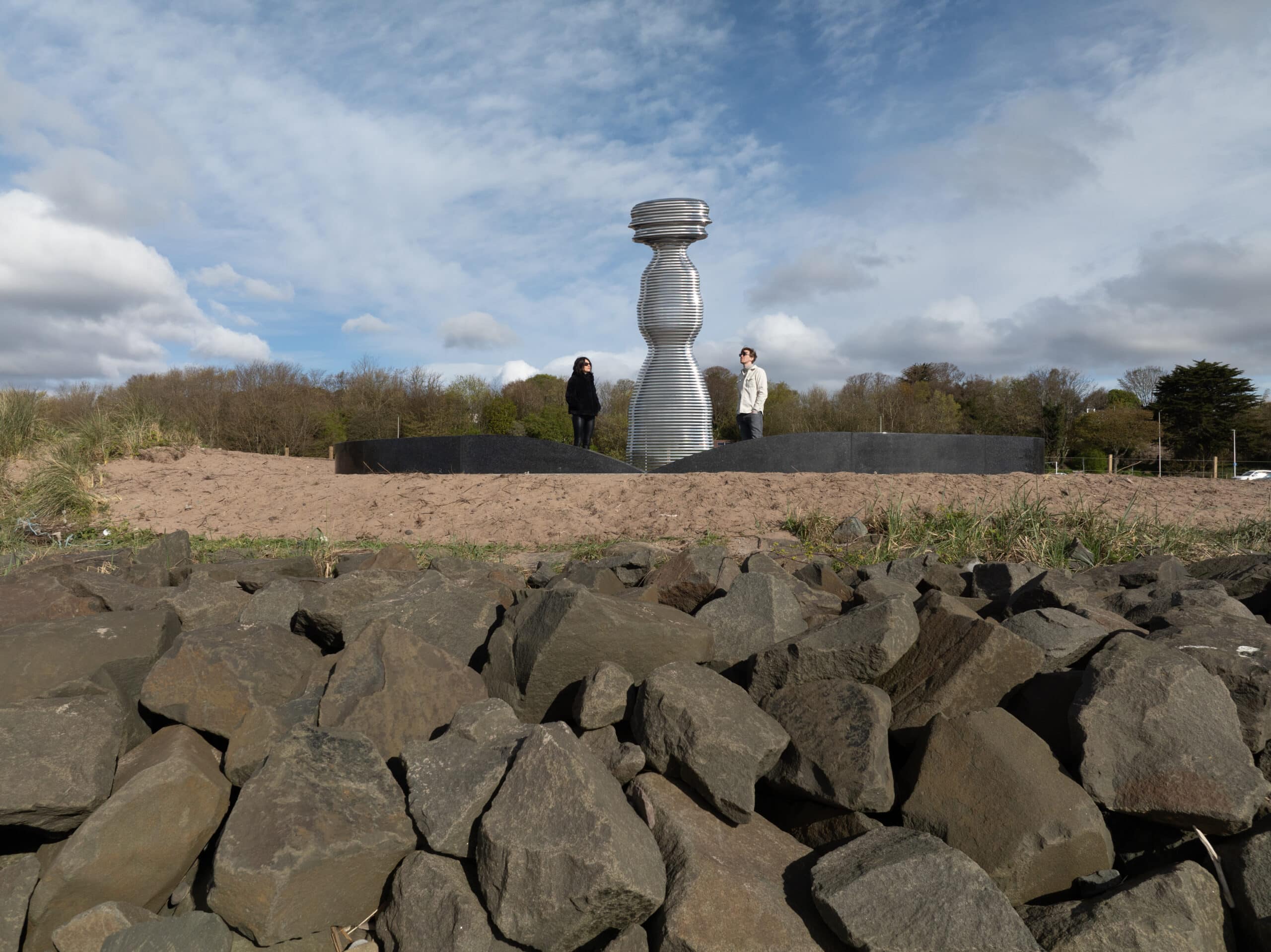 Situated on the banks of the River Tay—Scotland’s longest river—Tay Haze stands just under four meters tall and is accessible via a newly developed active travel route stretching from Broughty Ferry to Monifieth. Set against the vast expanse of the River Tay, the sculpture’s specially chosen location sits at a natural outcrop that extends into the river, creating a beacon-like presence reminiscent of the lighthouses visible in the distance.