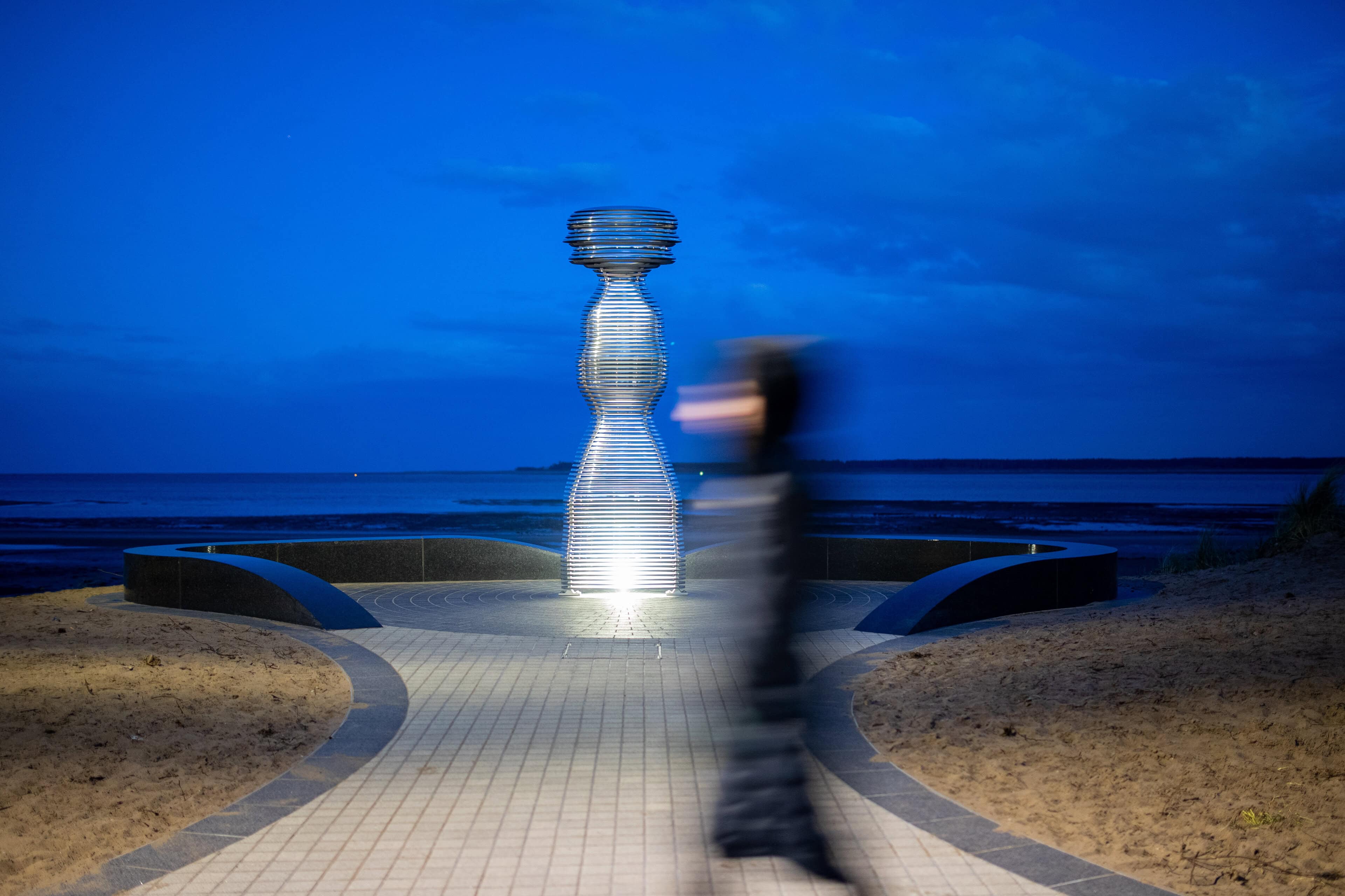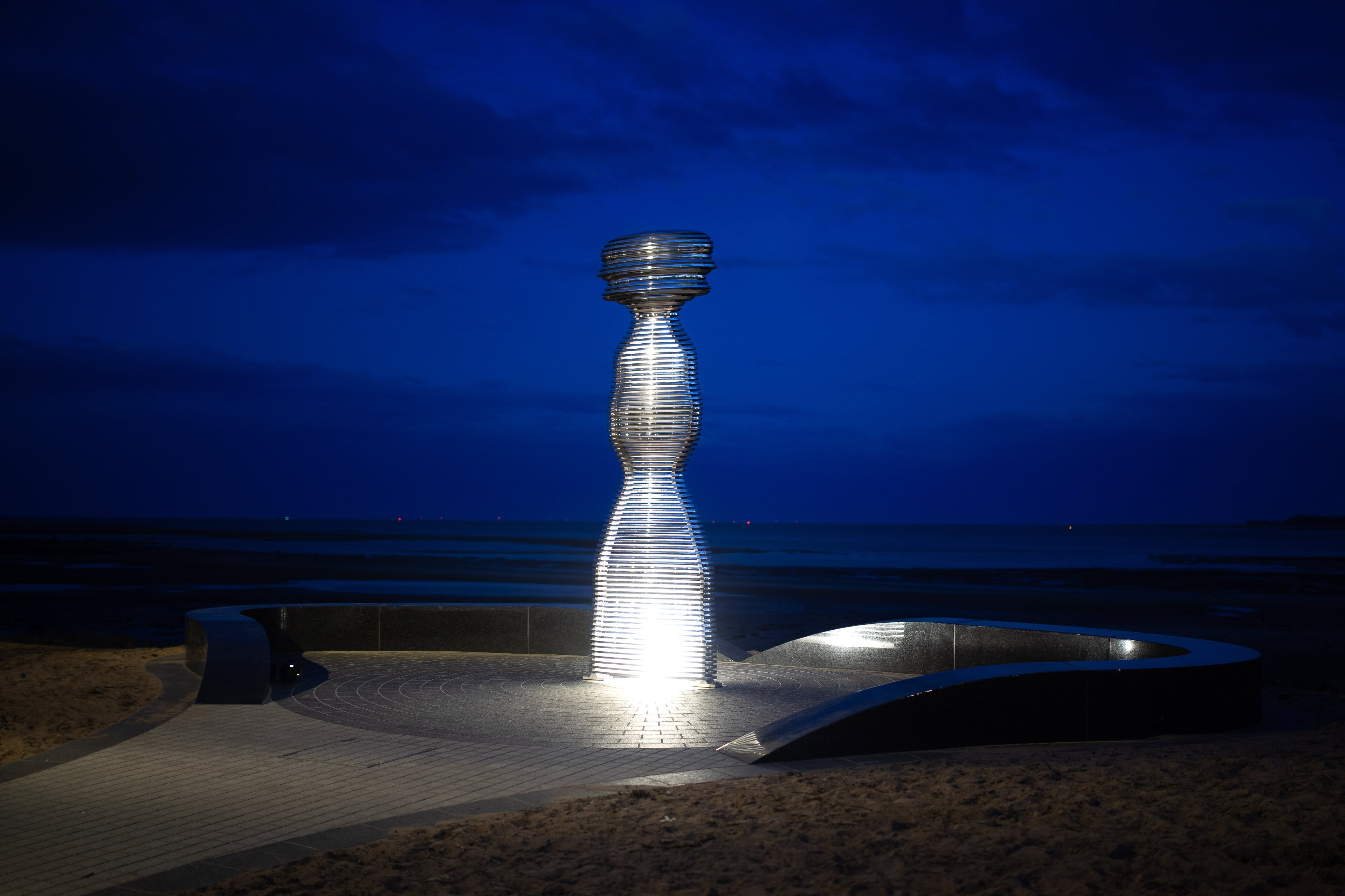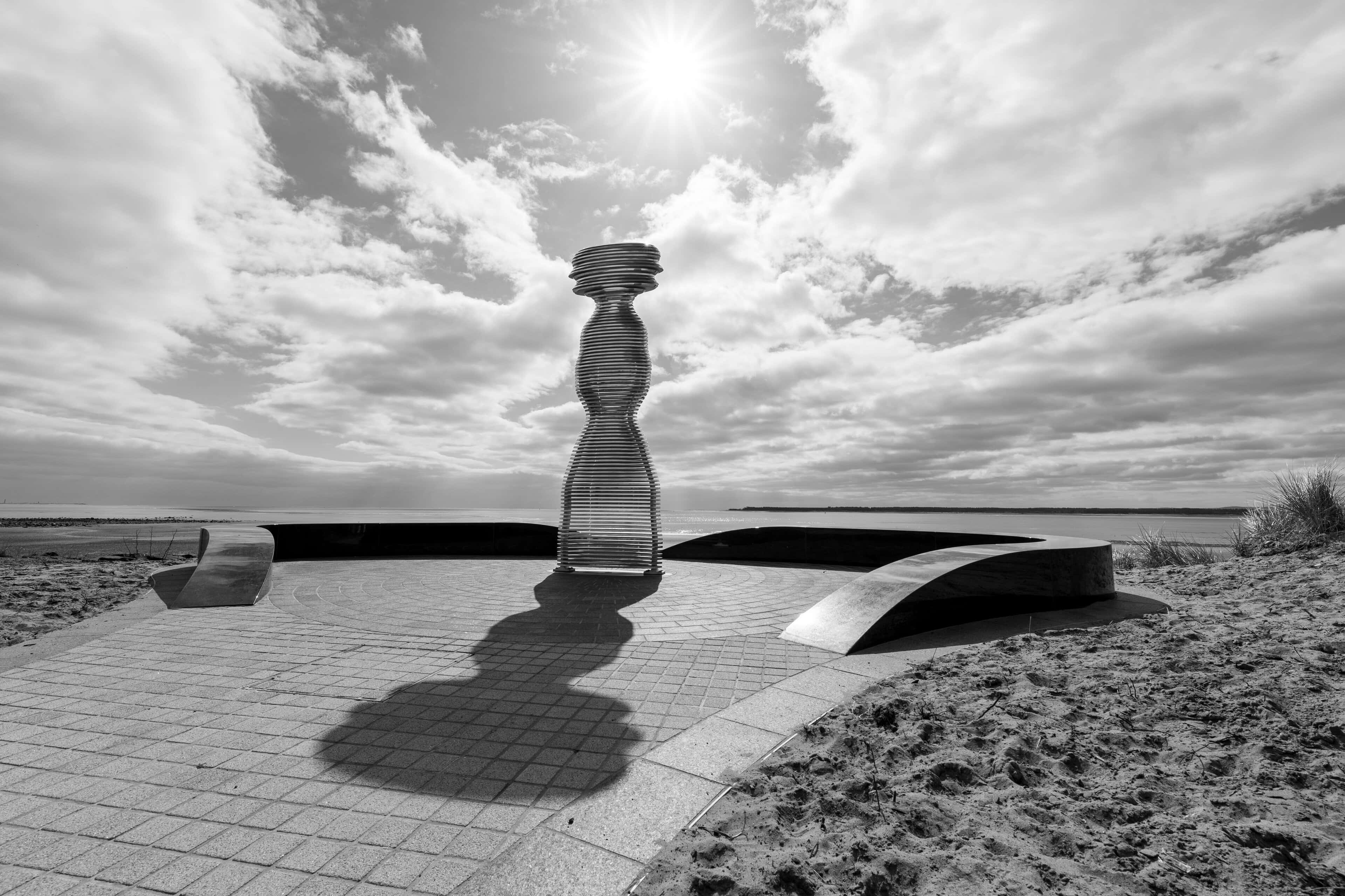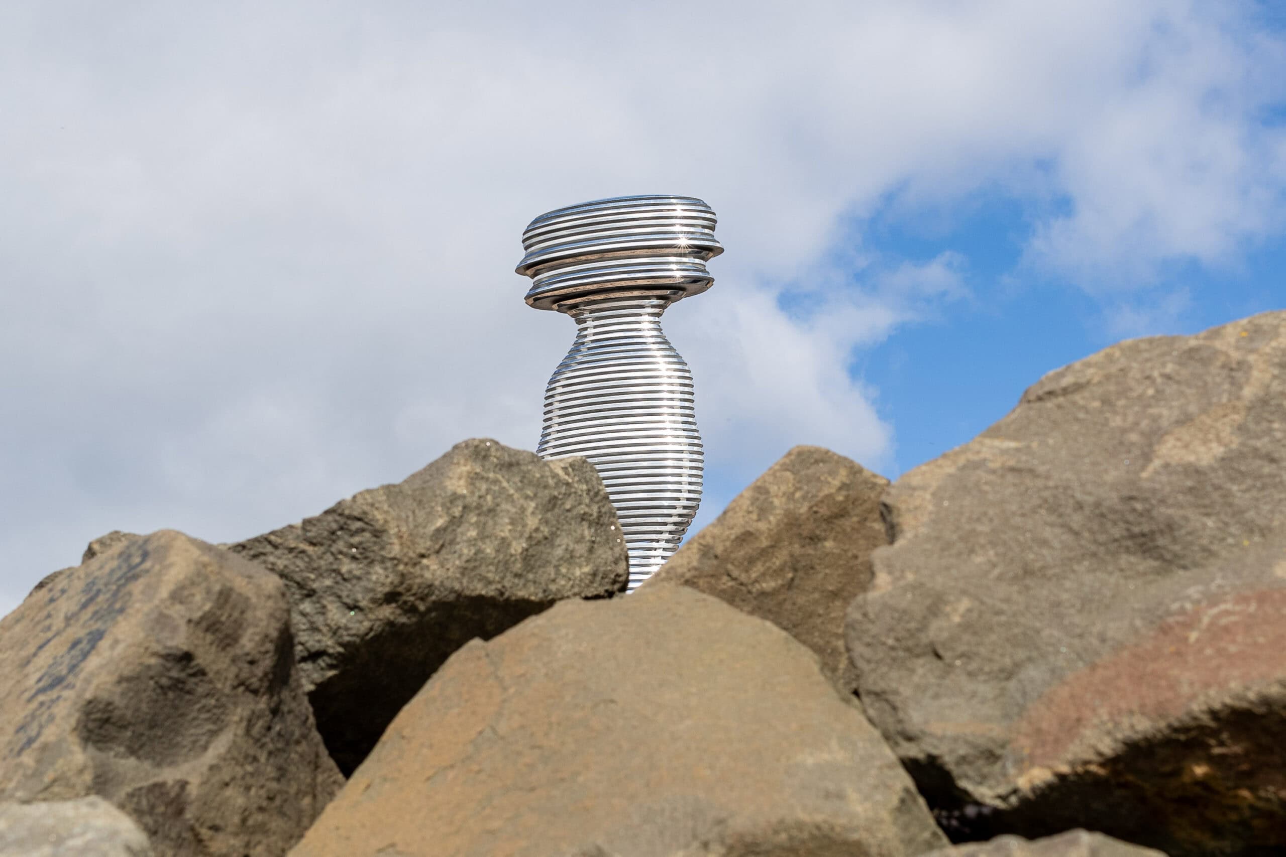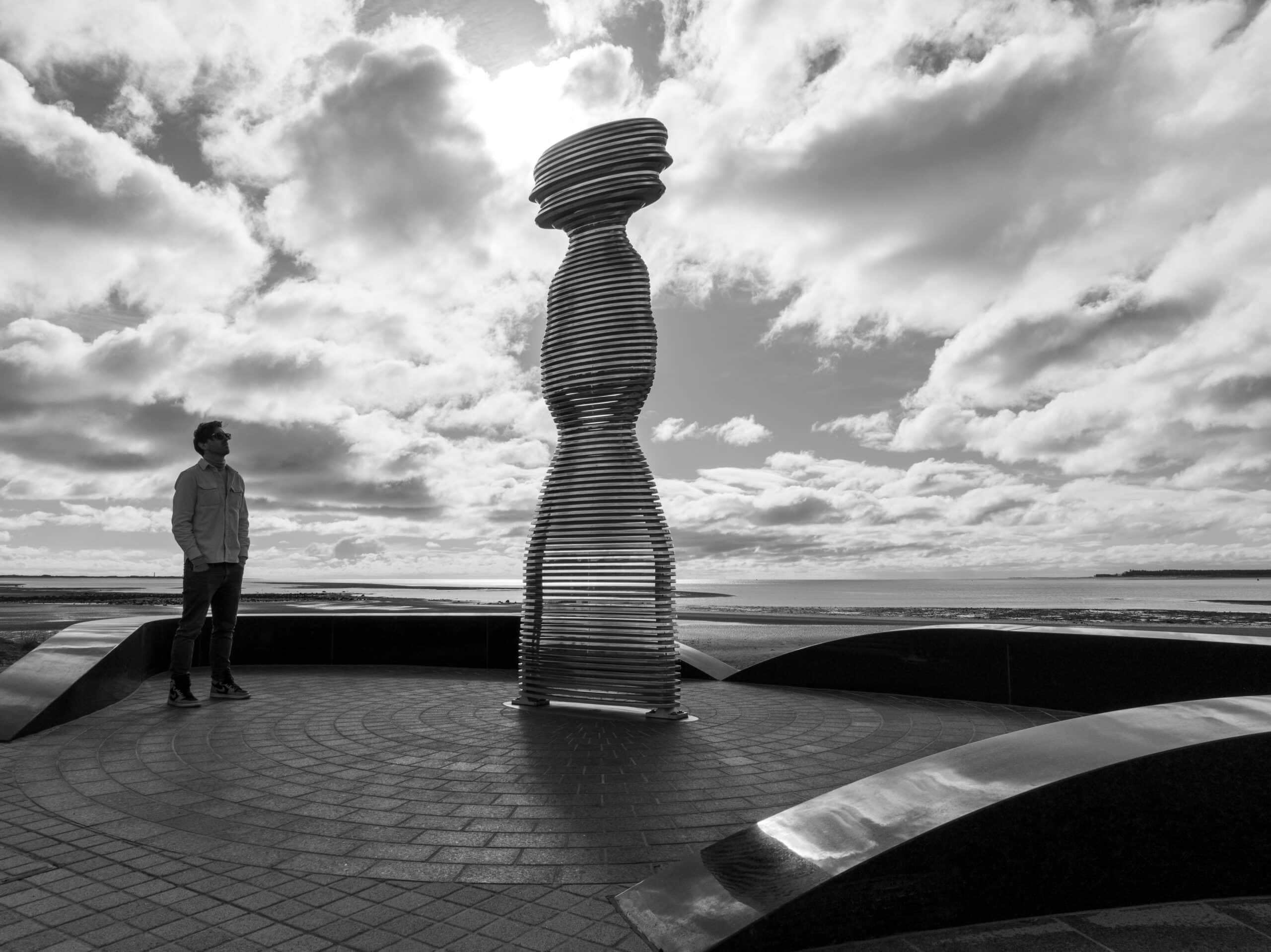 Situated on the banks of the River Tay—Scotland’s longest river—Tay Haze stands just under four meters tall and is accessible via a newly developed active travel route stretching from Broughty Ferry to Monifieth. Set against the vast expanse of the River Tay, the sculpture’s specially chosen location sits at a natural outcrop that extends into the river, creating a beacon-like presence reminiscent of the lighthouses visible in the distance.