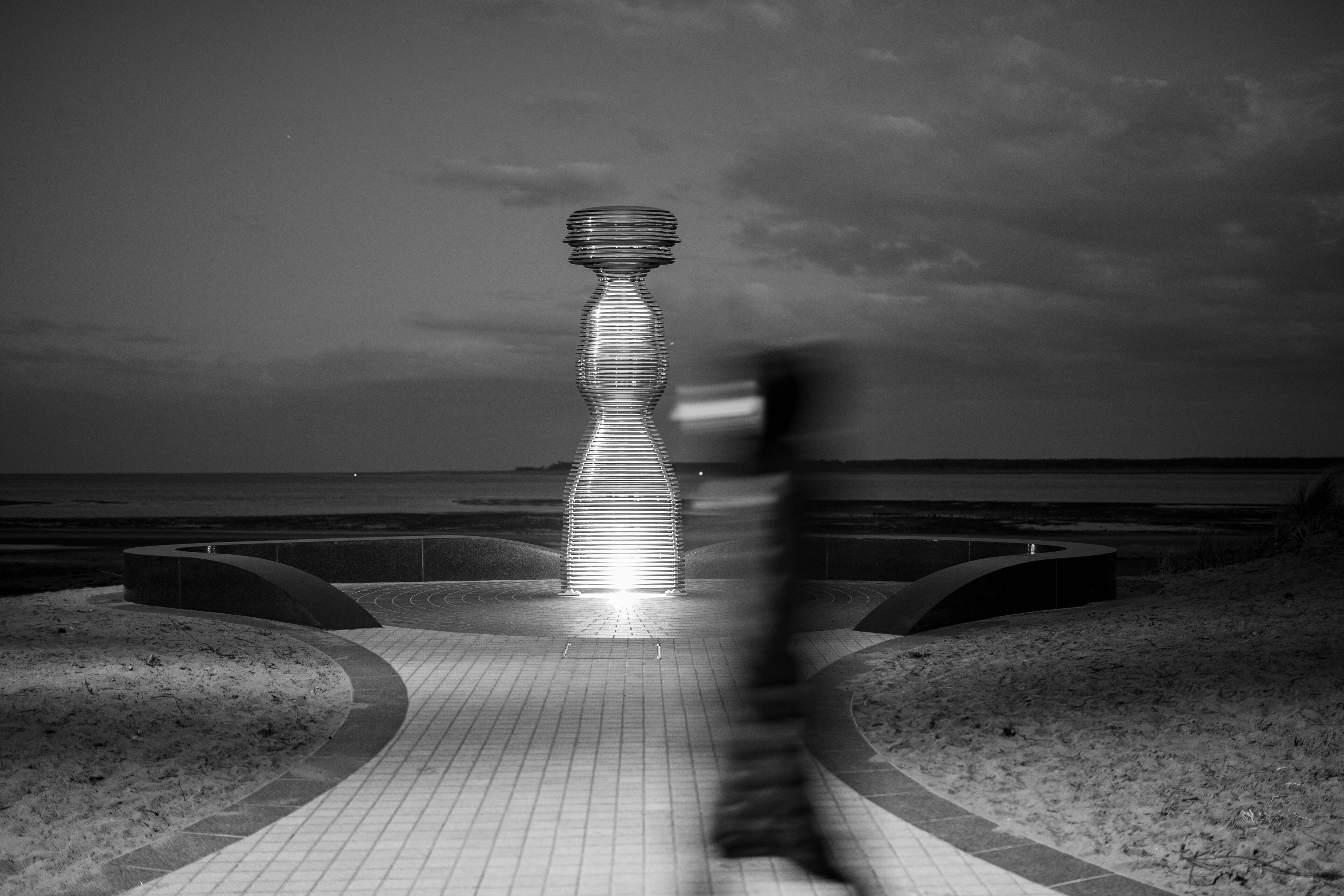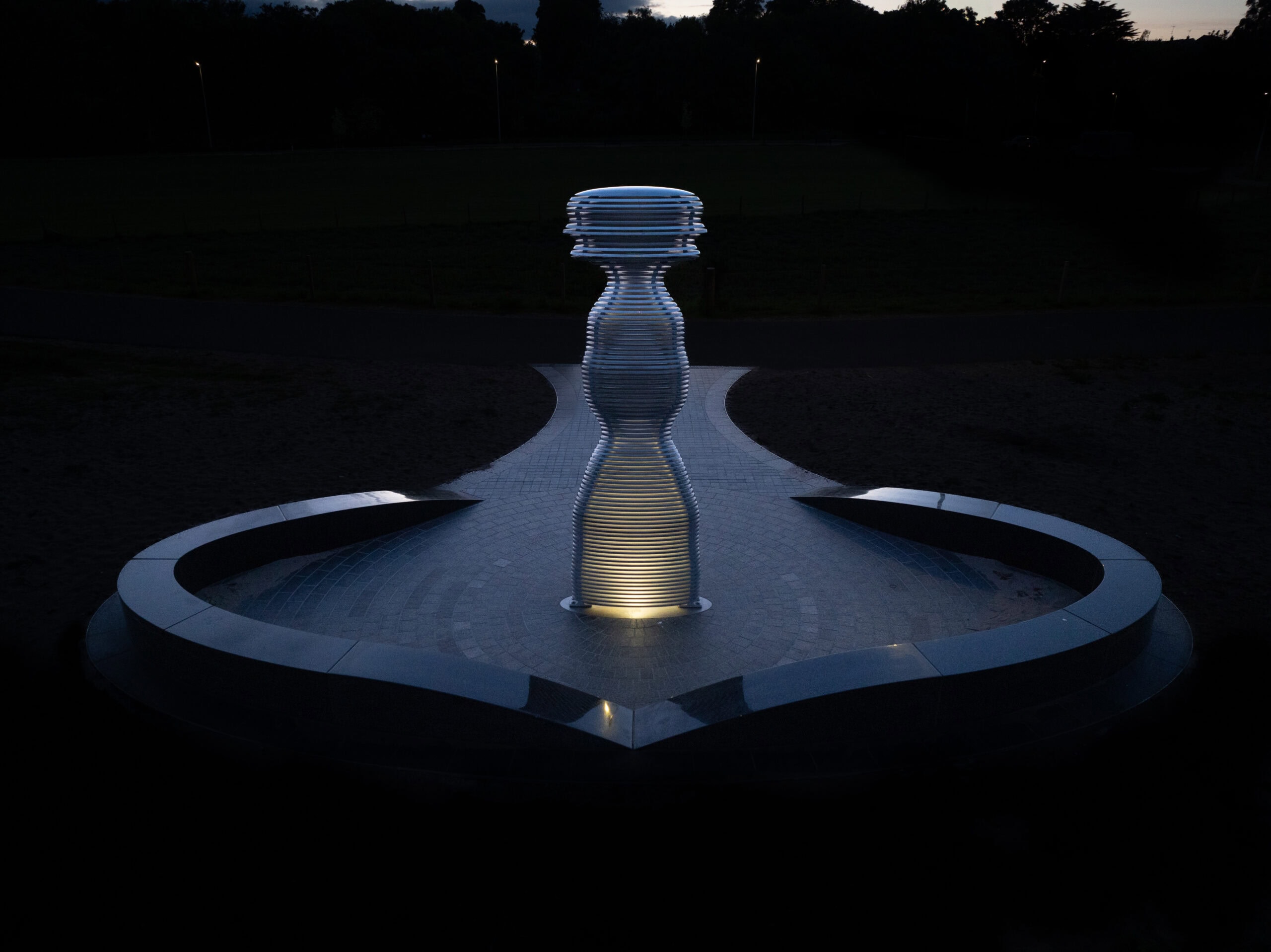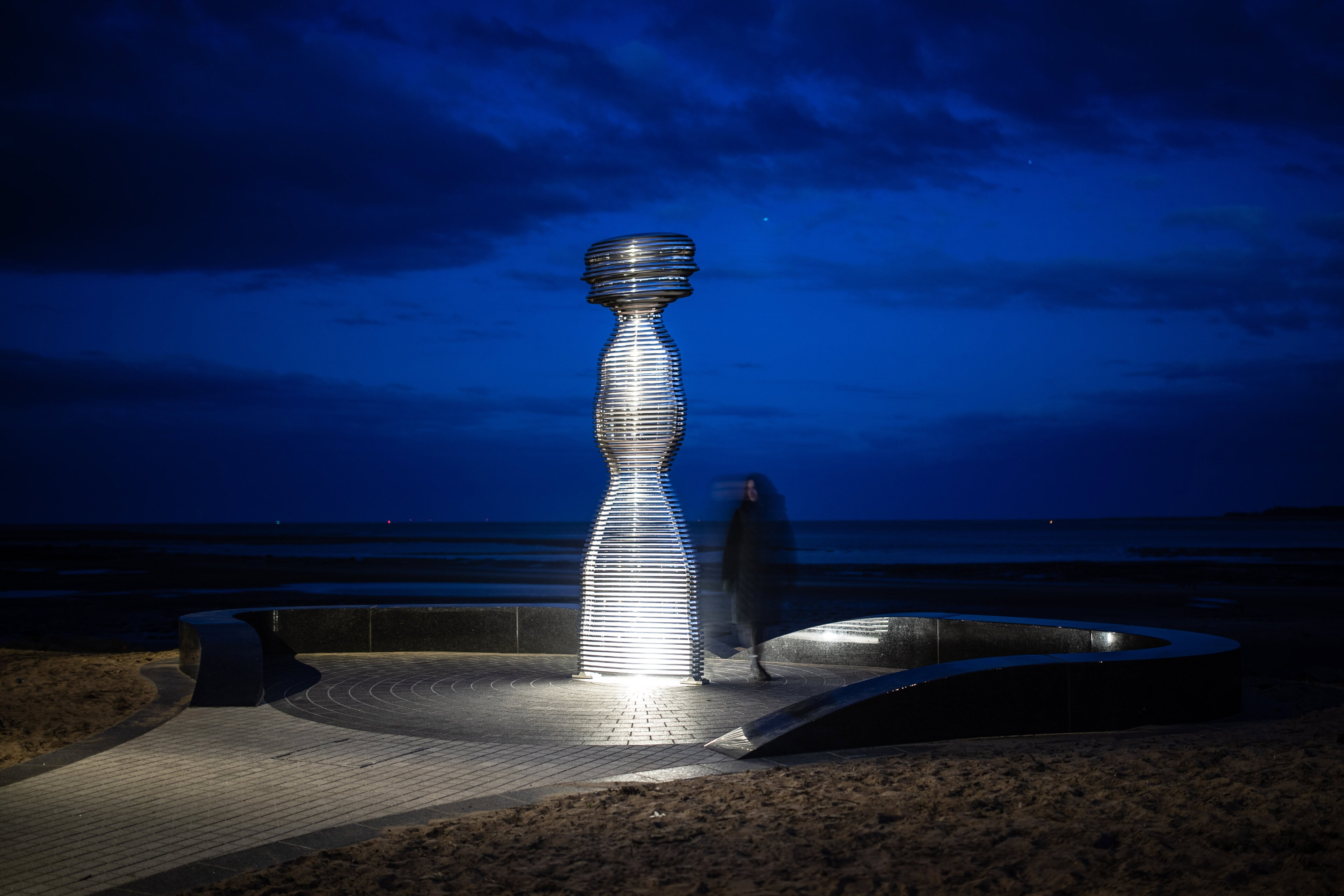 “Having the privilege to place a sculpture in this beautiful location—against the backdrop of one of Scotland’s most mesmerizing rivers—was something I approached with deep intent. I wanted the piece to visually interact with and connect to the landscape. The human form in motion is sliced to evoke a fragmented, shifting silhouette, reflecting our ephemeral nature and the idea that we are merely passing through time. The polished aluminium edges catch glimpses of the surrounding environment, while the sliced form invites views through to the horizon and river beyond. In the evening, the sculpture comes alive—its internal structure illuminated by subtle uplighting, creating a faint beacon that can be seen from a distance along the riverbanks.”