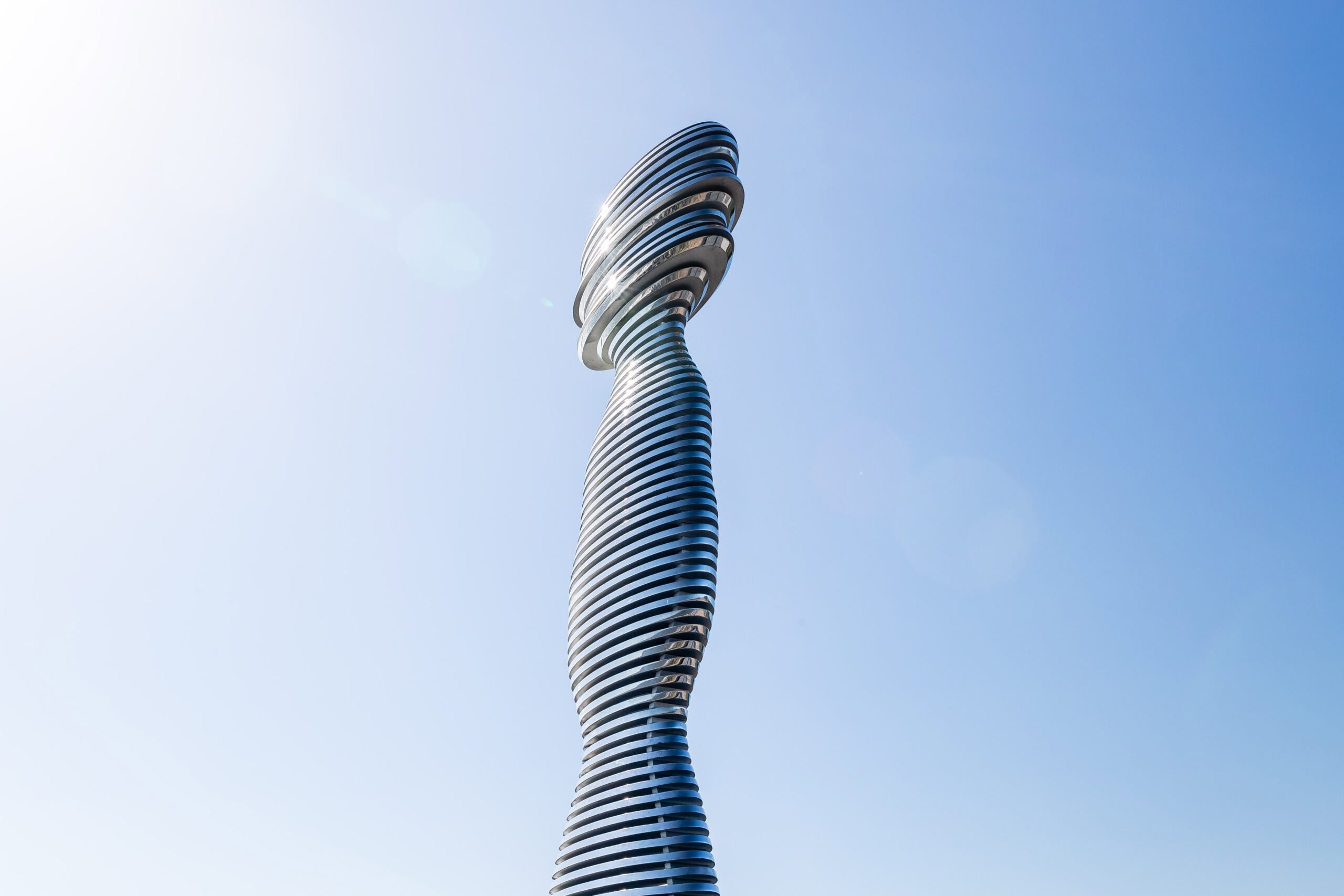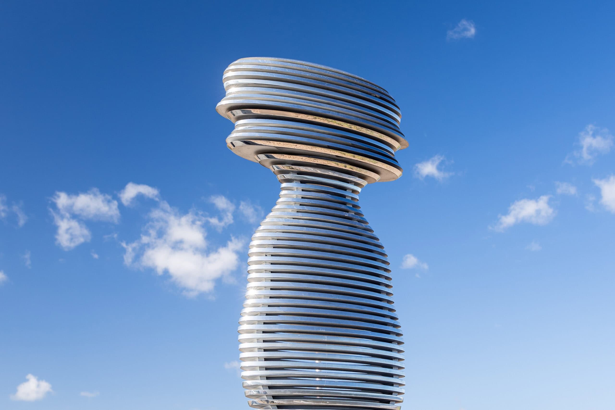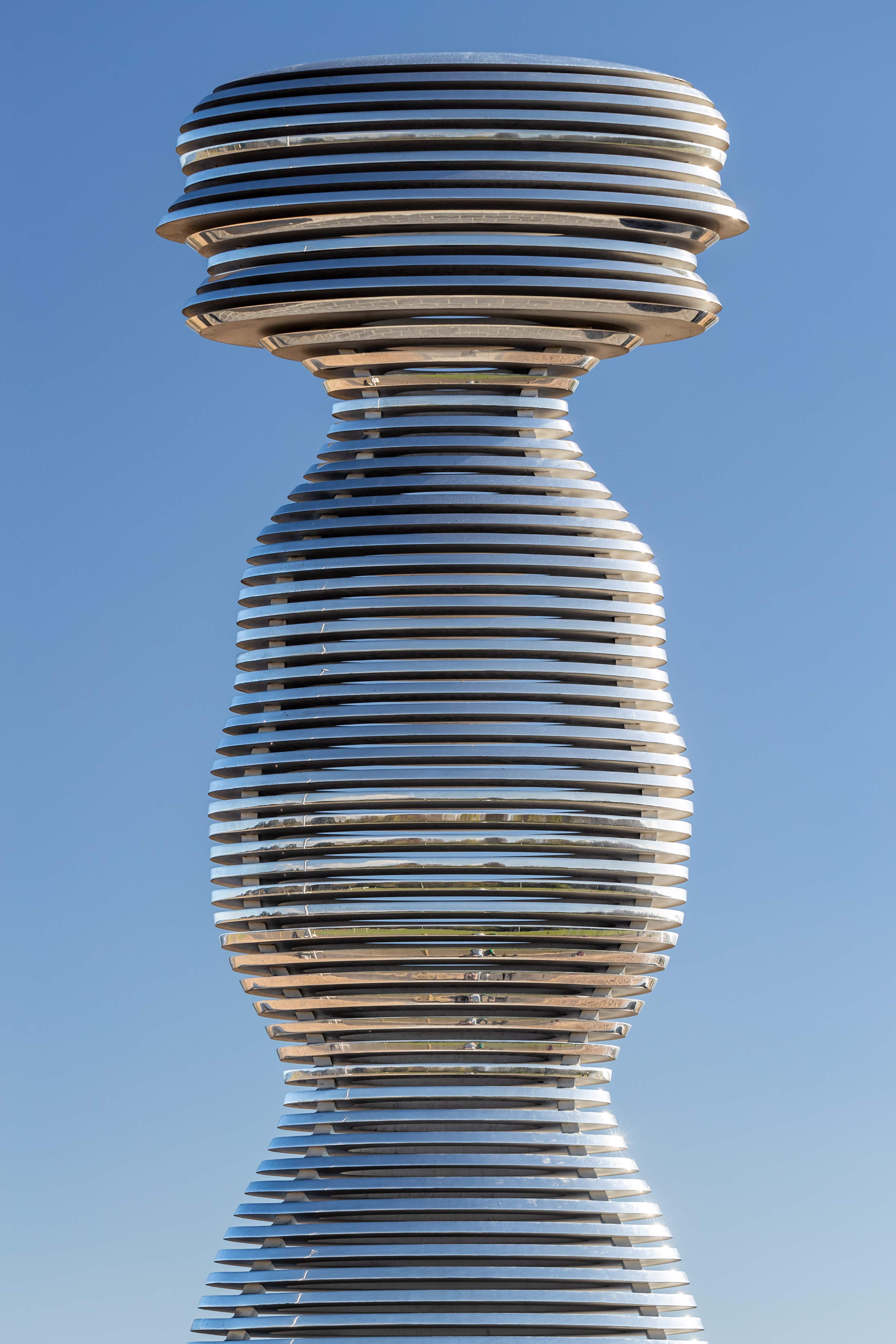 Unveiled in May 2024,Tay Haze is an exploration of time and movement, inspired by long-exposure photography. Using a side-profile photograph of the artist’s wife and muse, Simmons distorted and stretched the image to form the sculpture’s dynamic shape—symbolizing the transient human form in motion along the new 2.5-mile footway and cycleway.